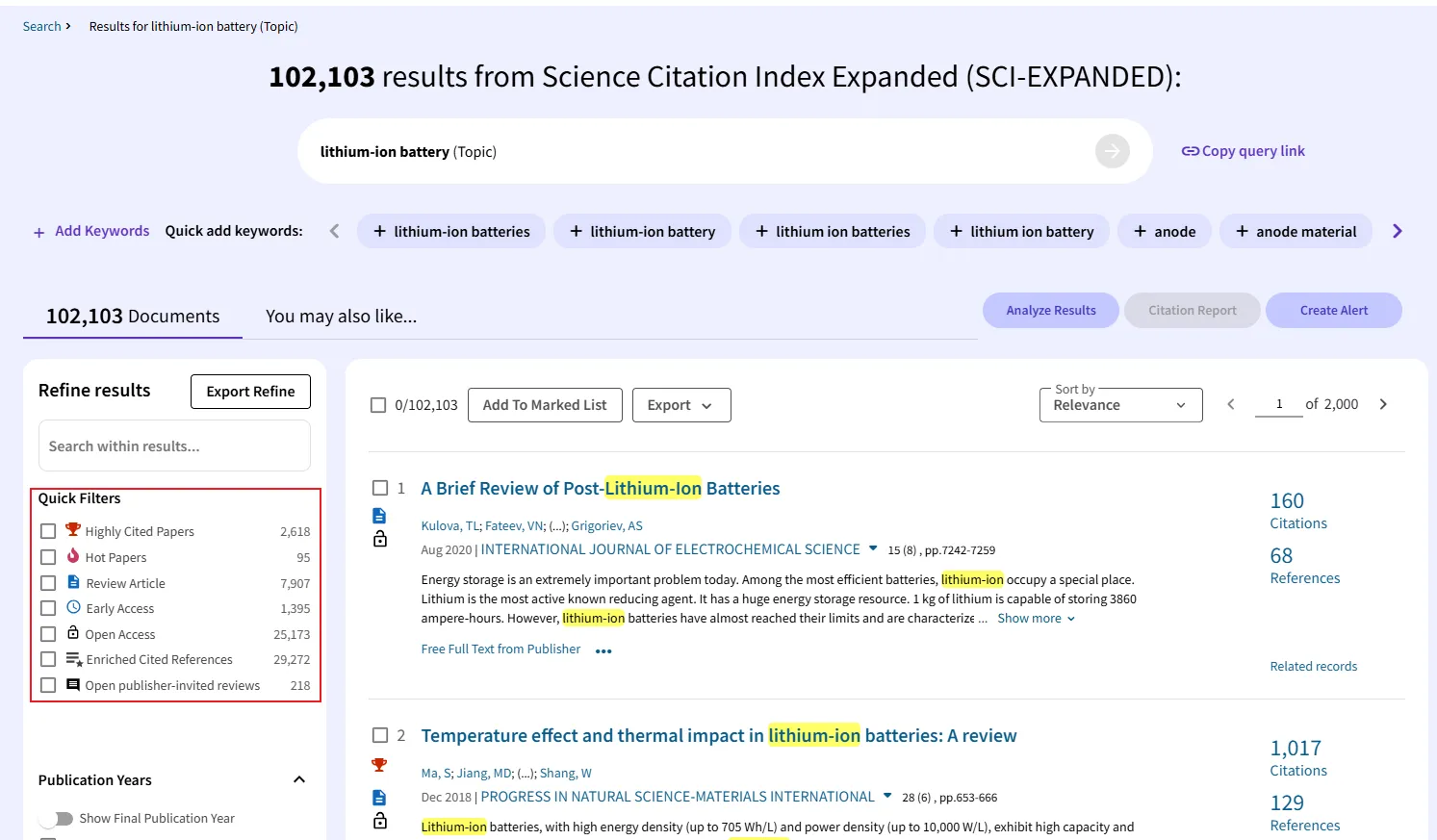 登录 WOS 后,选择 “SCI-EXPANDED” 数据库,输入关键词(如 “lithium-ion battery”)、作者(格式为 “作者姓 + 名字首字母”,例如 “Brian C”)或期刊名,即可检索相关 SCI 论文;还可通过筛选 “近 5 年”“高被引论文(领域内引用量 Top1% 的论文)”,快速掌握研究热点与前沿方向。