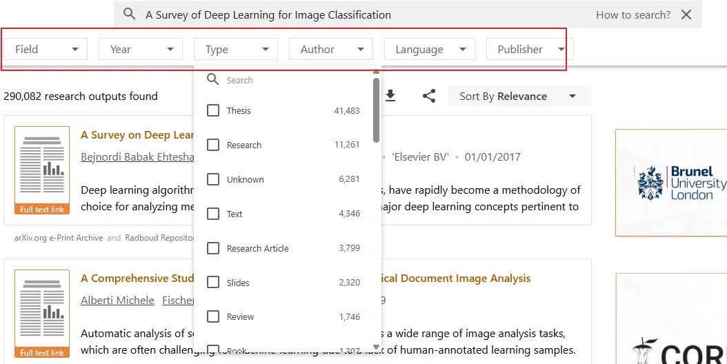 打开 CORE 官网(https://core.ac.uk/),首页就是简洁的搜索框,不用注册账号也能用(注册后能解锁收藏、警报等功能,后面会说)。想找什么直接输关键词,比如 “机器学习 图像识别”“乡村振兴 经济模式”,也能精准搜标题或作者,比如 “《A Survey of Deep Learning for Image Classification》”,输完点搜索就行。