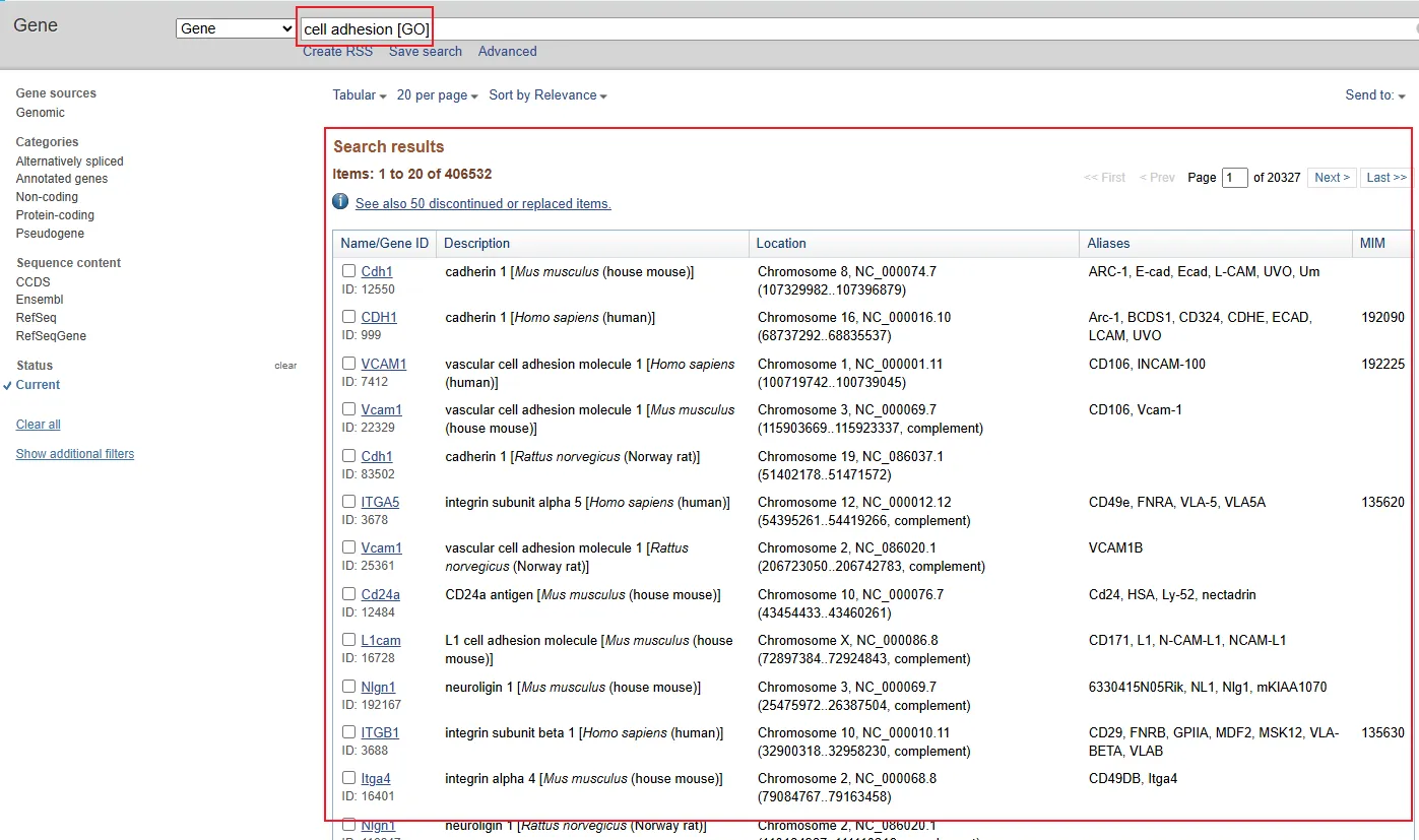 比如想找 “细胞黏附”(cell adhesion)相关的基因,或者已知 GO 编号(比如 10030),想确认对应的基因。