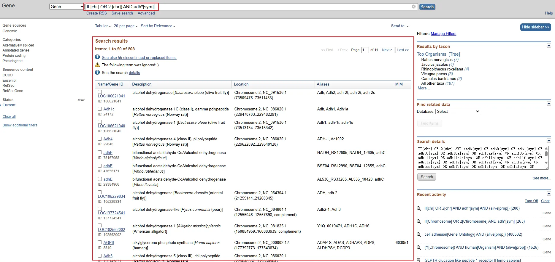 例子 2:找果蝇或小鼠第 2 号染色体上的 ADH 相关基因,输 “(II [chr] OR 2 [chr]) AND adh*[sym]”(“*” 是通配符,代表 “ADH 开头的所有基因”;“OR” 代表同时包含两种染色体编号)。