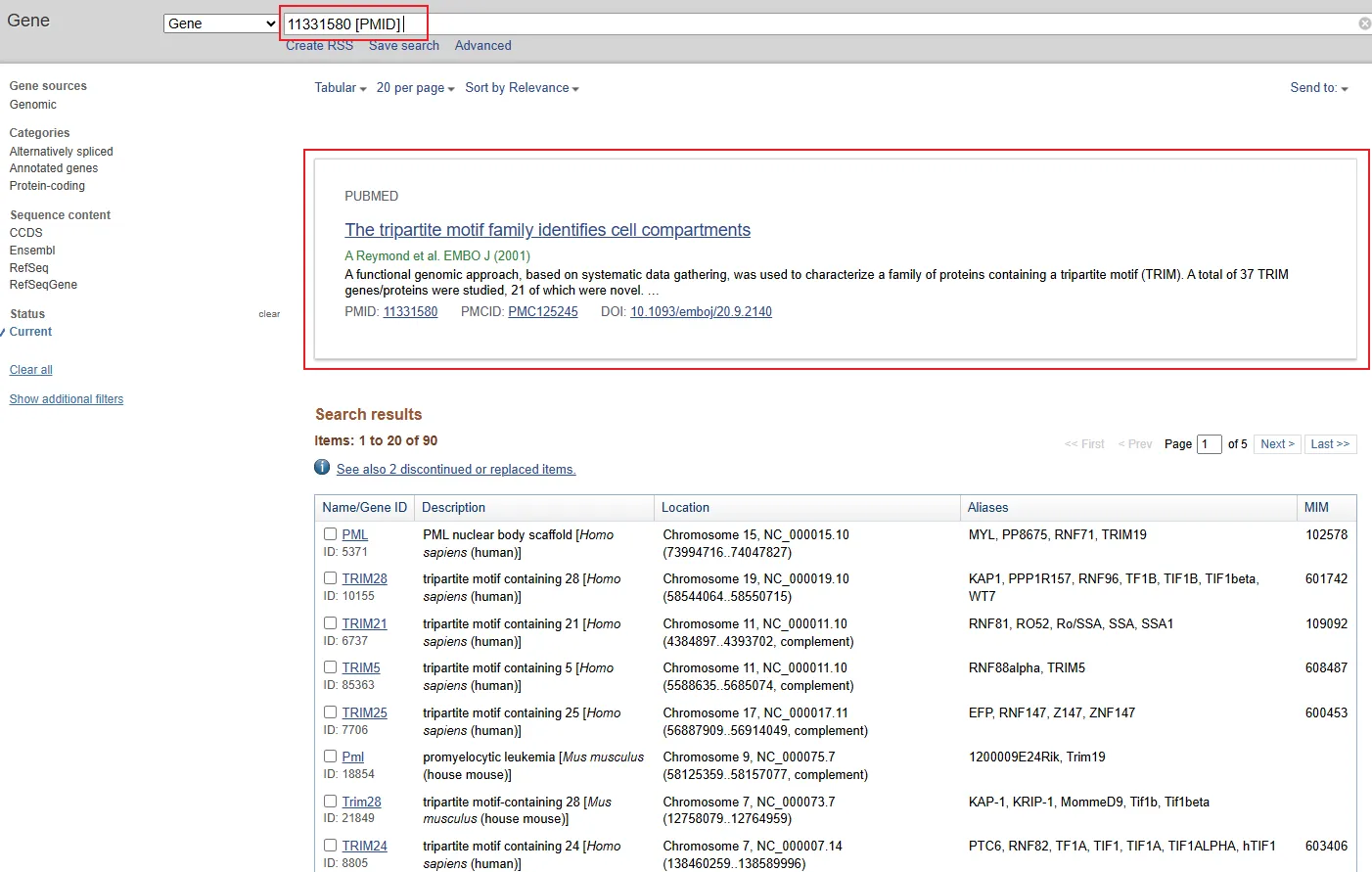 例子:输 “11331580 [PMID]”,就能直接关联到这篇文献研究的基因,不用再通读全文找基因名。