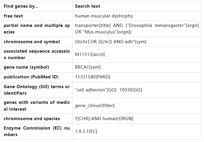 Gene数据库在检索上其实和我们使用pubmed是类似的。它的检索方式有多种。我们既可以检索基因名;同时也可以检索某一文献的PMID来获得这个文献的相关基因。同时也可以检索某一疾病得到和这个疾病相关的所有基因。下面的表格上是一些检索的官方例子。