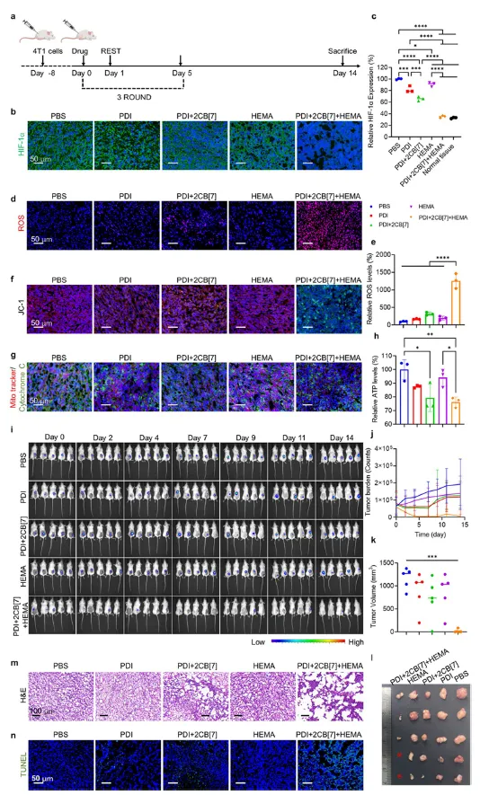 此外,研究还发现,该体系能够在一定程度上缓解肿瘤组织的缺氧状态。肿瘤缺氧是肿瘤发展和治疗抵抗的重要因素之一,该体系通过某种机制改善了肿瘤组织的缺氧微环境,进一步增强了其抗肿瘤的效果。这可能是由于聚合反应引发的一系列生物学效应,影响了肿瘤组织内的血管生成和代谢过程,从而改善了氧气的供应。这些动物实验结果充分证明了乏氧引发的细胞内聚合在实际抗肿瘤治疗中具有高效、安全的特点,为该疗法从实验室走向临床应用提供了坚实的实验依据。