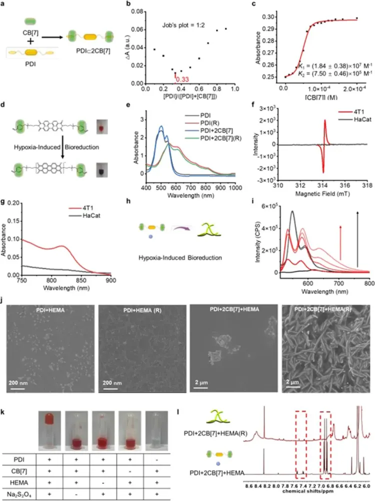 面对传统疗法困境,王瑞兵团队另辟蹊径,提出创新解决方案。他们聚焦于葫芦 [7] 脲(CB [7])和苝二酰亚胺衍生物(PDI),经巧妙设计,使两者形成独特的 2:1 超分子主客体复合物 PDI + 2CB [7]。该复合物能敏锐感知肿瘤组织特有的乏氧和还原微环境。肿瘤组织因快速增殖和血管生成异常,处于缺氧状态,且氧化还原平衡与正常组织不同,还原性更强。PDI + 2CB [7] 复合物在这种特殊微环境刺激下,发生化学反应,产生离域自由基阴离子。其中,CB [7] 不仅参与复合物形成,还凭借独特分子结构和性质,显著增强自由基阴离子稳定性,确保后续细胞内反应稳定进行,避免自由基过早淬灭或引发副反应。