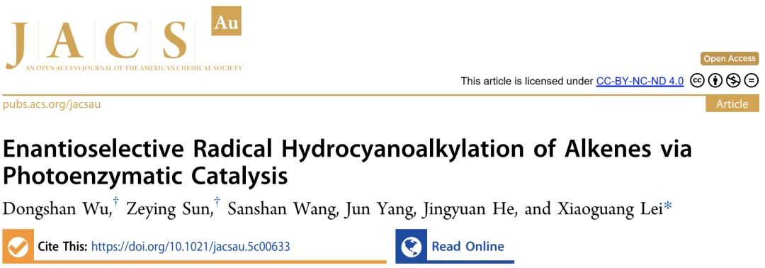 Dongshan Wu, Zeying Sun, Sanshan Wang, Jun Yang, Jingyuan He, Xiaoguang Lei* “Enantioselective Radical Hydrocyanoalkylation of Alkenes via Photoenzymatic Catalysis” JACS Au 2025, doi: 10.1021/jacsau.5c00633