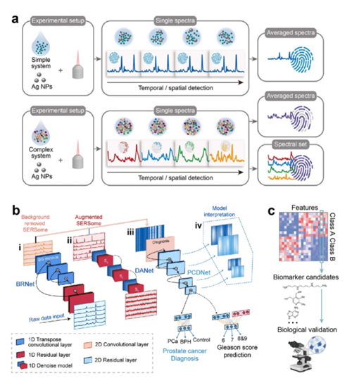 过去十年,随着纳米材料制备、传感平台制造和人工智能(Artificial intelligence, AI)辅助光谱分析等方面的飞速进展,SERS在生物医学领域的应用迅速扩大。本综述聚焦SERS在生物医学应用中的最新进展,涵盖高性能增强基底的设计、可穿戴和微流控平台等诊断设备,以及AI算法辅助的光谱解析与定量分析。SERS正在逐步实现从基础研究向临床转化,为核酸、蛋白、代谢物和细胞外囊泡的精准检测,以及组织成像和体内深部探测提供强大支撑。