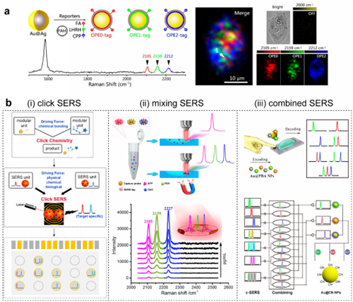 缝隙增强拉曼探针(Gap-enhanced Raman nanotags, GERTs)通过金属核壳结构与内嵌于金属缝隙中的拉曼活性层,实现强等离激元耦合效应,具备高信号亮度和强光稳定性;正交拉曼探针则在“生物拉曼透明窗口”( 1800-2800 cm⁻¹)中提供高信噪比信号,有效避开内源性干扰,适合多通道检测(图3);近红外二区(Near-infrared II, NIR-II)SERS纳米具备更高的组织穿透能力,极具活体检测应用潜力。
