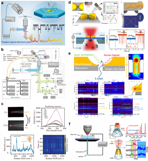 光镊技术可通过聚焦激光束精确操控微米和纳米尺度物体,提升SERS测量的精度与稳定性。部分银包覆的二氧化硅微球作为可光学捕获的SERS移动探针,用于细胞膜的空间扫描检测;光学操控多个金属纳米颗粒形成瞬时“热点”,显著增强SERS信号;等离激元纳米孔系统将贵金属增强效应与传统纳米孔技术相结合,在纳米孔内部产生电磁热点,通过电场控制可实现单分子的高效捕获与分析(图4)。例如,金碗状纳米孔已成功用于DNA碱基的单分子SERS识别,兼具电信号与拉曼信号的同步读取。此外,基于SERS的可穿戴设备也日益成熟,具备非侵入性和便捷使用的独特优势。其中的可穿戴汗液传感器,能检测电解质、代谢物、激素等多种分子,为个性化健康管理和疾病早筛提供了强有力的技术支持。