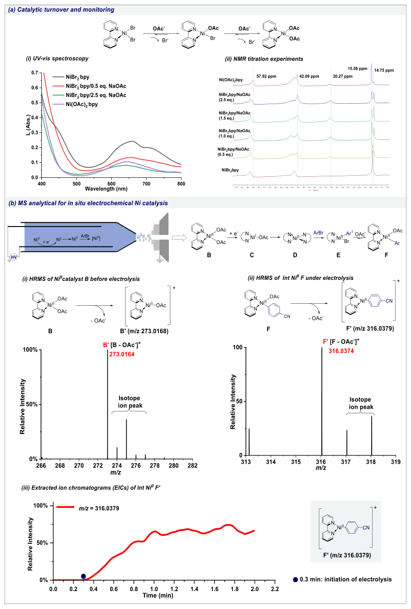 作者还利用原位电化学质谱首次捕捉到了低价镍与芳基溴化物经氧化加成生成的中间体(图4)。在0–0.3 min的初始阶段(未施加电解电压),检测到m/z = 273.0164的[NiIIbpy(OAc)]+信号,该信号由催化物种B失去OAc-获得。随后在施加持续电压0.3 min后,检测到m/z = 316.0374的[ArNiIIbpy]+物种,其来源于芳基溴化物的氧化加成。离子流色谱显示,[Ar–NiIIbpy]+物种随着电压的施加显著积累,表明其生成是电解驱动的。