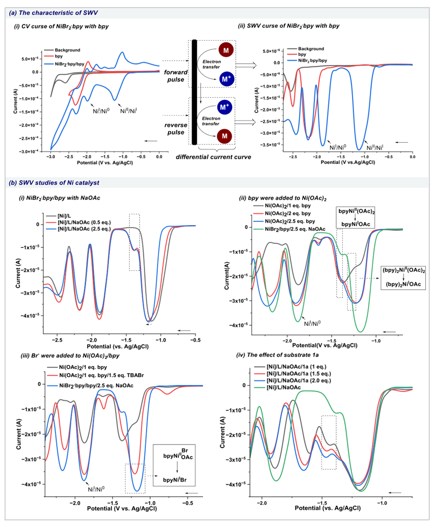 为了更好地理解OAc-在镍催化电化学 C–O 偶联中的作用,作者采用了首先采用了方波伏安法(SWV)对反应体系进行了研究。SWV通过测量正反脉冲电流的差值来增强催化电流信号,可以更精确地评估镍氧化态的变化。如图3所示,相较于循环伏安曲线。方波伏安法扫描出的曲线显示出更清晰的镍价态变化信号。利用这一特性,作者进一步探讨了NaOAc在催化体系中的作用。证实了OAc-可作为类卤素配体,改变了镍的配位环境。此外,利用SWV还能够有效区别出单配位和双配位镍络合物。在4-溴苯甲腈滴定实验中,作者发现随着4-溴苯甲腈浓度的增加,–1.42 V的电流响应显著增强,而–1.17 V的峰电流保持不变。这一结果强有力地证明了与OAc-配位的镍物种在芳基卤化物的氧化加成中表现出更高的催化活性。