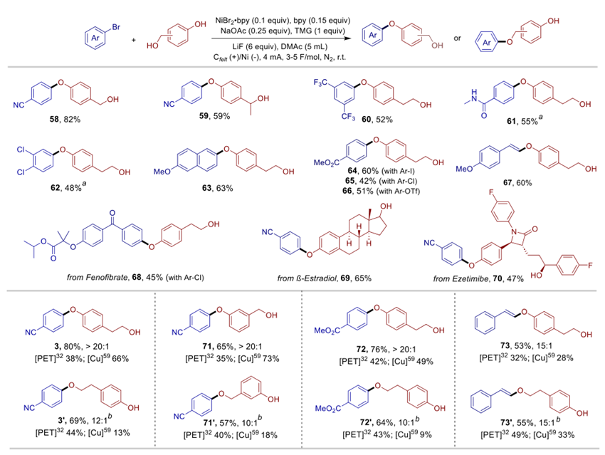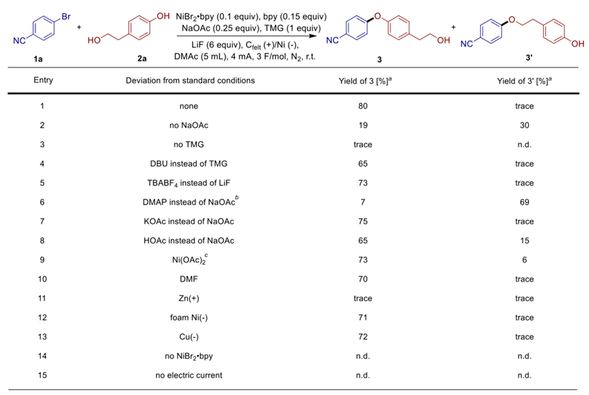作者首先以4-溴苯甲腈基和4-(2-羟基乙基)苯酚为起始原料,发现在没有添加NaOAc的条件下二芳基醚产物仅以19%的分离收率获得,同时芳基烷基醚的分离收率达到30%。这一结果表明在该体系中醇羟基发生偶联的竞争性更为显著,且产物选择性偏低。在加入25 mol%的NaOAc后,反应性能得到了显著提升。产物二芳基醚在该条件下以80%的收率顺利获得,且反应的化学选择性优异,仅检测到痕量的芳基烷基醚产物。当DMAP的作为添加剂时,芳基烷基醚的收率能达到69%,产物选择性为12:1。