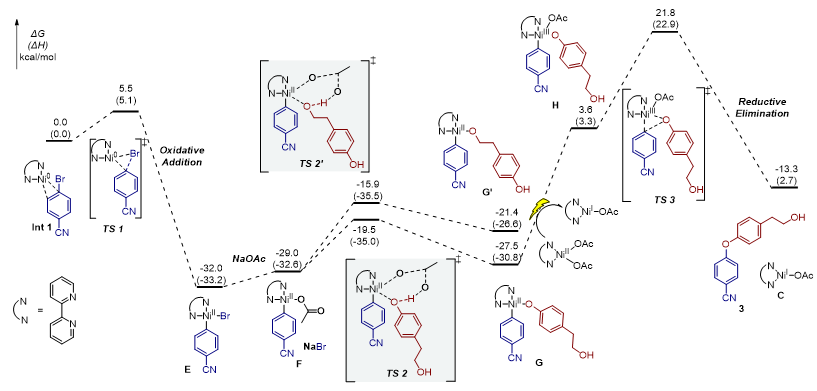 最后,作者进行了 DFT 计算(图6)。起始底物与 LNi0结合形成中间体 Int 1,该中间体随后经构象转变生成过渡态 TS 1。在氧化加成后,高效生成中间体 E,其 ΔG 为 –37.5 kcal/mol。中间体 E 随后与 OAc- 发生配体交换,形成中间体 F,其自由能仅为 3.0 kcal/mol。接着,在醋酸根的辅助下,醋酸根、酚羟基和镍中心之间形成稳定的六元环过渡态 TS 2,其活化自由能仅为 9.5 kcal/mol。该相互作用促进了通过 TS 2 的去质子化过程,从而得到中间体 G。相比之下,醋酸根、醇羟基和镍中心之间形成的六元环过渡态 TS 2' 稳定性较差,其活化能更高(13.1 kcal/mol),且后续去质子化的能垒也相对更高。因此,与醋酸根的相互作用有效降低了整个反应路径的活化能,从而通过优先促进芳基卤化物与酚类的偶联来提升反应选择性。在形成中间体 G 之后,低价镍物种通过电化学氧化转化为高价镍中间体 H。最后,高价 NiIII物种经由过渡态 TS 3 发生还原消除,生成二芳醚产物 3,同时释放相应的 NiI物种。