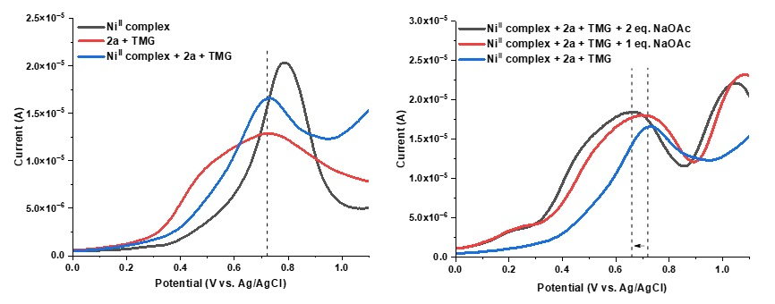接着,作者对合成的NiII complex [L'(Ar)NiII–Br]配合物进行了方波伏安测试(图5)。发现加入NaOAc后,[L'(Ar)NiII–OAr']的氧化电流显著增强。继续添加 NaOAc 时,氧化电位进一步移动至 0.67 V,并在 0.2 V 出现了一个新的峰,这可能表明 NiIII发生还原消除后累积的 NiI 物种被氧化。这些结果表明,NaOAc 加速了 [L'(Ar)NiII–Br] 向 [L'(Ar)NiII–OAr'] 的转化,并促进其进一步氧化为 [L'(Ar)NiIII(X)–OAr']。另一方面,NaOAc 可能通过配位效应降低NiII/NiIII转变的氧化电位。NaOAc 的这种双重功能可能减轻了酚类底物的氧化降解,从而合理解释了该体系对多种酚类底物的广泛兼容性。