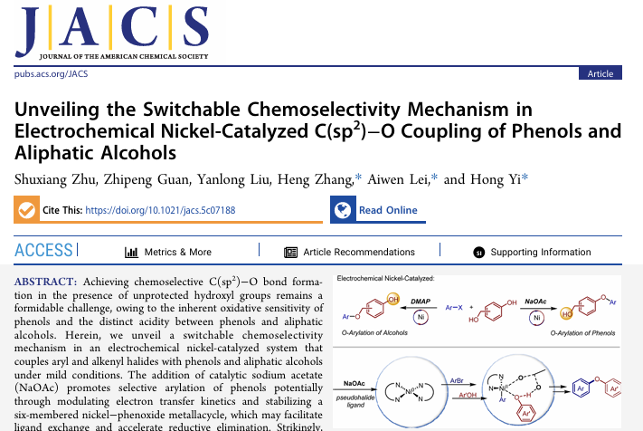 近日,武汉大学易红、雷爱文、张恒团队设计提出了一种电化学激活的镍催化体系,利用醋酸根离子(OAc-)调控镍的氧化还原循环,促进氧化加成、加速配体交换并抑制酚类底物的副反应,从而有效提升还原消除效率与反应选择性。机理研究表明,OAc-可能与酚羟基及NiII中心形成六元环中间体,稳定并加速反应过程。进一步,通过改变碱(NaOAc与DMAP的切换),可在芳基卤化物与酚类或醇类底物之间实现可编程的化学选择性调控。