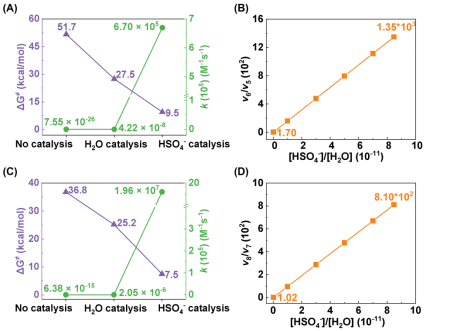 图3 中间体NH2CH2OH分别在无催化、H2O催化和HSO4-催化条件下的形成和分解。(A)NH2CH2OH生成的ΔG≠和k; (B)PM2.5中NH2CH2OH生成速率比v6/v5随浓度比[HSO4-]/[H2O]的变化; (C)NH2CH2OH分解的ΔG≠和k; (D)NH2CH2OH分解速率比v8/v7随浓度比[HSO4-]/[H2O]的变化