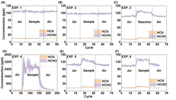 图4 通过PTR-QMS检测到的实验1-6中HCHO和HCN浓度的变化。六组实验在(A)没有·OH和额外酸根离子,(B)没有·OH,有SO42-,(C)有·OH,没有额外酸根离子,(D)有·OH和SO42-,(E)有·OH和Cl-,(F)有·OH和NO3-的条件下进行