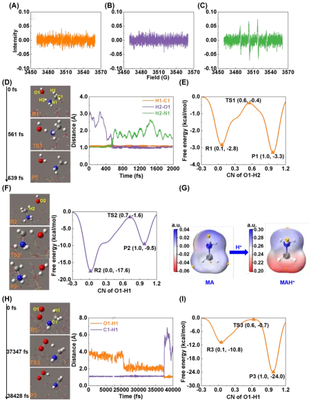 图1 ·OH引发的NH3CH3+的氧化。在pH =4-6的条件下:(A)无过氧化氢、避光,(B)无过氧化氢、自然光照和(C)有过氧化氢、自然光照的EPR光谱。·OH对NH3CH3+的氧化:·NH2CH3+生成的:(D)关键距离演变和(E)自由能分布,(F)·NH3CH2+生成的自由能分布。(G)甲胺质子化前后静电势能面的变化,其中黄色的球代表静电势的最大点。·NH2CH3+的O2氧化反应:(H)关键距离演变和(I)自由能分布。R、TS和P分别表示反应物、过渡态和产物。距离演变通过BOMD模拟确定,自由能分布通过MTD模拟计算