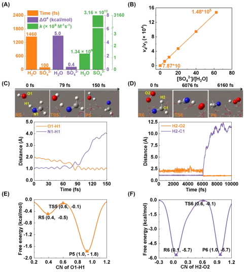 图2 臭氧化活性中间体NHCH2的形成和氧化反应。(A)NH2CH2+被H2O/SO42-脱质子生成NHCH2的反应时间,ΔG≠和k。反应时间和ΔG≠是根据附录图A.5中的BOMD和MTD结果计算出来的。(B)PM2.5中NHCH2产率比v4/v3随[SO42-]/[H2O]浓度比的变化。NHCH2与·OH和O2的氧化反应:(C、D)关键距离演变和(E、F)自由能分布