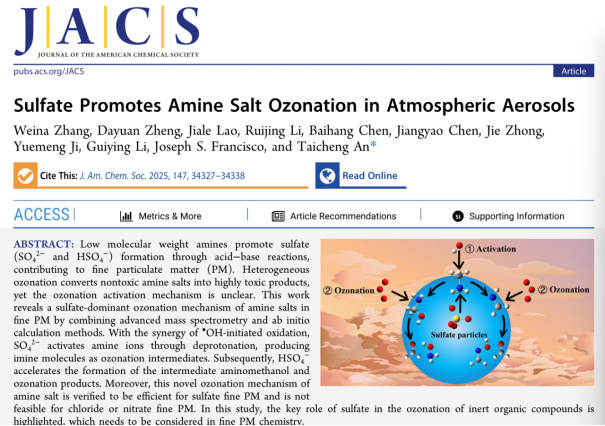 近日,广东工业大学环境健康与污染控制研究院、环境科学与工程学院安太成教授团队与美国宾夕法尼亚大学Joseph S. Francisco教授团队合作,在大气气溶胶中硫酸盐促进胺盐臭氧化的微观化学机制上取得重要进展。研究成果以《Sulfate Promotes Amine Salt Ozonation in Atmospheric Aerosols》为题,发表于《J. Am. Chem. Soc. 2025, 147(38), 34327-34338; https://doi.org/10.1021/jacs.5c04343》。论文第一作者为张维娜副教授,通讯作者为安太成教授,广东工业大学为论文第一单位。