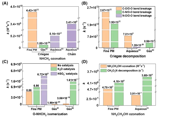 图5 NHCH2和NH2CH2OH在细颗粒物、气相和液相中的臭氧化反应的k。(A)NHCH2通过克里吉和链式路径的臭氧化;(B)克里吉中间体分解;(C)O-NHCH2异构化;(D)NH2CH2OH臭氧化。其中PM2.5的k是根据图3-7和3-8中的MTD结果计算出来的, 而气相和液相的k则是由文献得知的