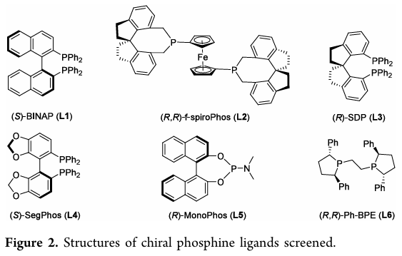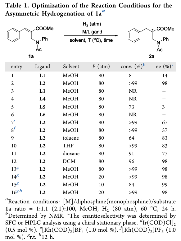 以(E)-甲基-3-苯基-2-((N-苯基乙酰胺基)甲基)丙烯酸酯(1a)为模型底物,使用几种市售手性磷配体(包括(S)-Binap (L1)、(R,R)-f-spiroPhos (L2)、(R)-SDP (L3)、(S)-SegPhos (L4)、(R)-MonoPhos (L5)和(R,R)-Ph-BPE (L6))与金属前体[Rh(COD)Cl]2组合,在80 atm H2、MeOH中60°C反应24小时进行不对称氢化条件优化。研究发现大多数配体(L1、L3、L4和L6)在该氢化反应中效果不佳,转化率和对映选择性都很低。虽然使用单膦配体(R)-MonoPhos (L5)可提供73%的转化率,但对映选择性太低(3% ee)。