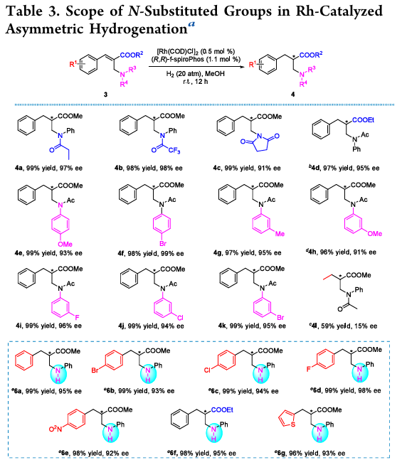 研究发现,在优化反应条件下,N-丙酰基和N-三氟乙酰基底物3a和3b都可以氢化,以相当优异的对映选择性(97-98% ee)和产率(98-99%)得到相应的手性产物4a和4b,与N-乙酰基底物1a得到的结果相当。但N-琥珀酰亚胺基底物3c提供的产物对映选择性较低,为91% ee。类似地,(E)-乙基-3-苯基-2-((N-苯基乙酰胺基)甲基)丙烯酸酯3d也可以转化为手性产物4d,产率97%,对映选择性高(95% ee)。
