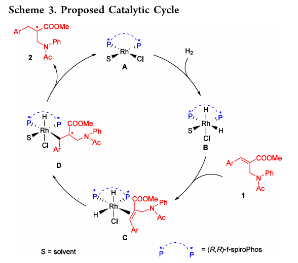 为了深入了解不对称氢化的可能催化机制,进行了氘代标记实验。使用D2在甲醇中进行模型底物1a的铑催化不对称氢化。得到的产物2a-D-1在α-和β'-位都显示出氘掺入,氘富集度分别为0.97和0.95。当氢化在CD3OD中使用H2进行时,在产物2a-D-2中未检测到氘掺入。这些结果表明氢化仅发生在C=C键上,没有同位素交换或溶剂参与还原过程。基于氘代标记实验,提出了该氢化的合理机理途径。催化循环始于H2与Rh(I)/(R,R)-f-spiroPhos配合物A的氧化加成,生成Rh(III)氢化物中间体B。随后底物1与B配位形成中间体C,接着C=C键迁移插入Rh-H键得到中间体D。最后,还原消除释放手性产物2并再生活性Rh(I)催化剂A,从而完成催化循环。