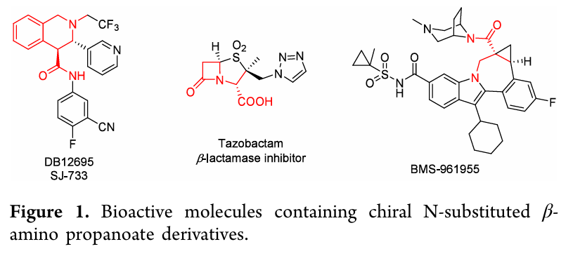 手性β-氨基丙酸酯是一类重要的结构单元,广泛存在于众多药物分子和生物活性分子中。例如,SJ-733作为一种有效的PfATP4抑制剂,最近被确定为治疗疟疾感染的临床评估候选药物。N-取代的β-氨基丙酸酯衍生物在制备β-内酰胺抗生素(如他唑巴坦)的核心结构中发挥重要作用。小分子化合物BMS-961955是一种激酶抑制剂,靶向特定激酶用于治疗病毒感染或炎症性疾病。因此,开发高效合成手性β-氨基丙酸酯的方法具有重要意义。