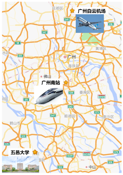 (1)广州白云机场:可于T1、T2航站楼乘坐机场大巴至江门候机楼(金凯悦酒店),再乘坐出租车至五邑大学(约3.9公里,10分钟);线上预定机场大巴请关注公众号:白云机场空港快线。