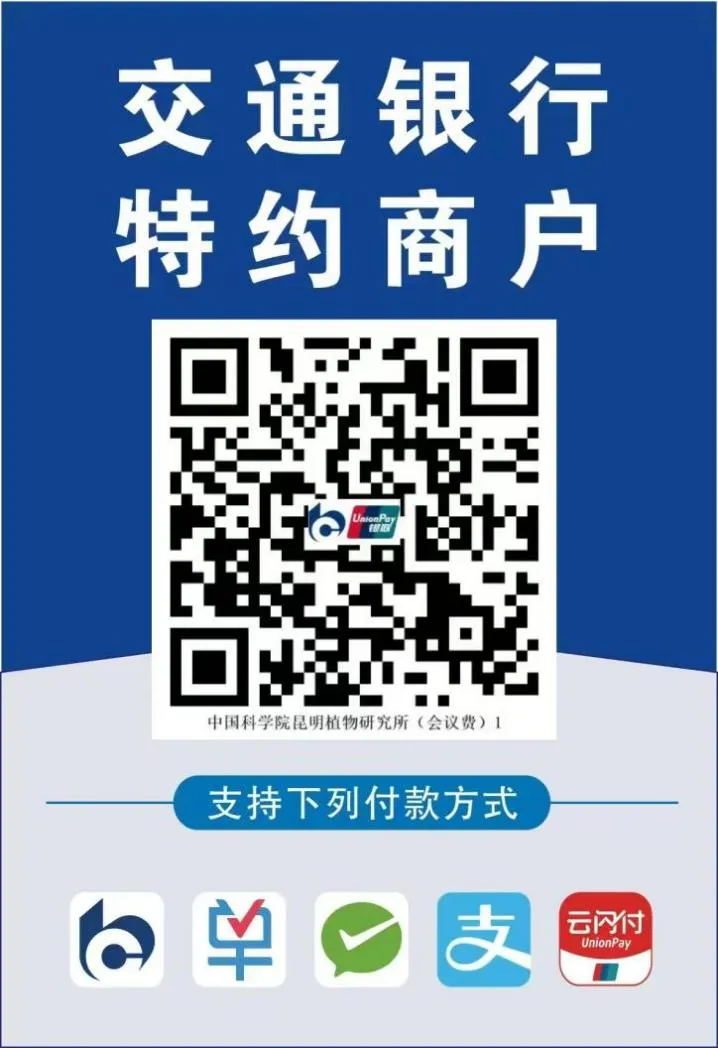 3. 付款方式:支持银行转账支付、扫码支付、现场刷卡或二维码支付,本次会议由会议共同主办方中国科学院昆明植物研究所收取会务费并开具发票。
