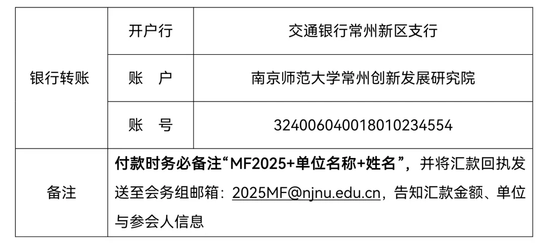 付款时务必备注“MF2025+单位名称+姓名”,并将缴费回执发送至会务组邮箱:2025MF@njnu.edu.cn,告知汇款金额、单位与参会人信息。