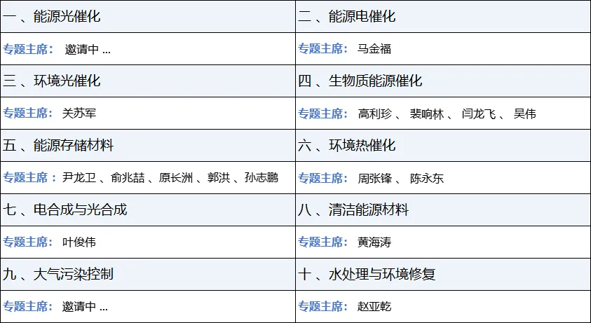 本次会议将围绕以下八大核心议题展开, 旨在汇聚国内外顶尖专家学者,共同探索能源材料与环境催化领域 的未来发展方向: