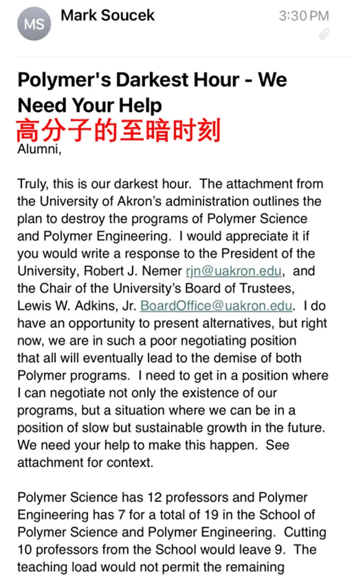 值得注意的是排名全美第一的高分子学院,阿克伦大学大学高分子科学与工程学院也在遭受至暗时刻。学院师资力量正在遭受削减,或将并入其他学院。