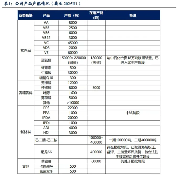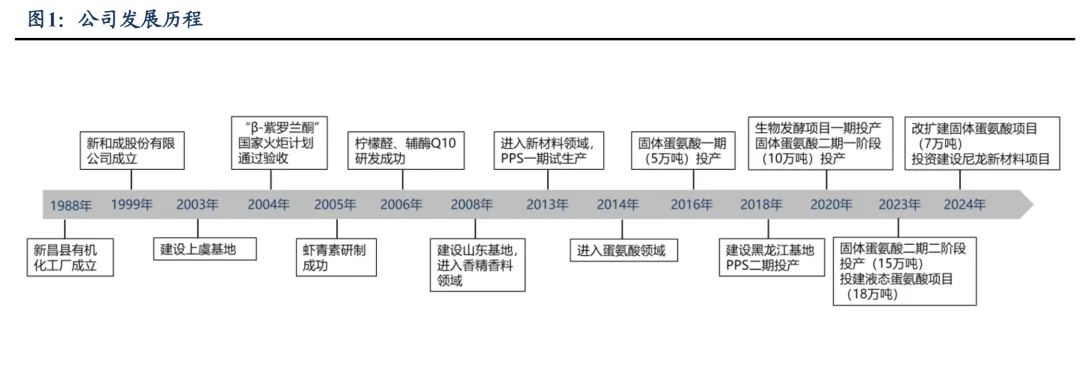深化布局(2018-2024年):2018年启动黑龙江生物发酵基地,2023年蛋氨酸二期投产,2024年扩建固体蛋氨酸并投资天津尼龙新材料项目,强化高分子材料产能协同;