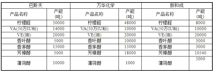 巨头的互相跨界竞争,一旦实力势均力敌,产业链上下游就面临洗牌:以柠檬醛为例,万华与新和成都是自产自用,成本优势可以卷下游维生素厂家,互相竞争的同时将瓜分其他企业的市场份额,重新洗牌维生素市场。
