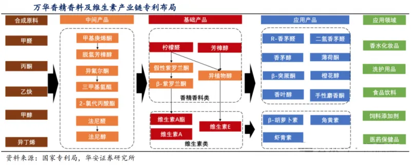 不仅新和成跨界万华擅长领域,万华也进军新和成关键产品柠檬醛市场。新和成三大主要产品为生素A、维生素E和蛋氨酸,柠檬醛作为最核心的中间体是合成维生素A和维生素E的必需品,新和成香精香料产品也是由柠檬醛作为关键原材料。