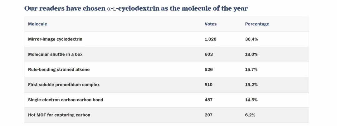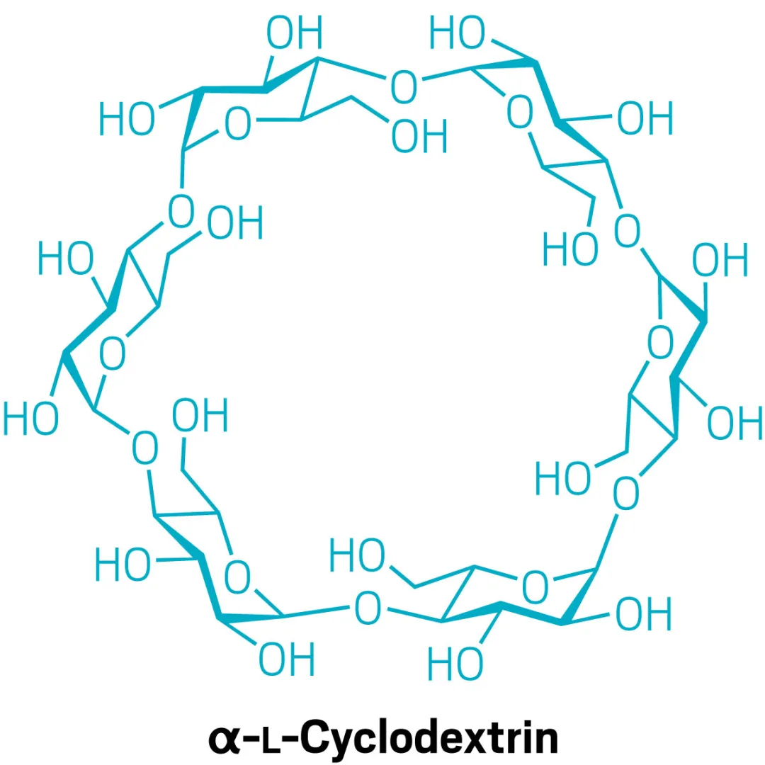 近日,美国化学会《化学与工程新闻》(C&EN) 编辑重点介绍了过去一年中读者们最喜欢的一些分子,其中经过读者投票,α-ʟ-环糊精 (α-ʟ-cyclodextrin) 被选为年度分子(见下图)。