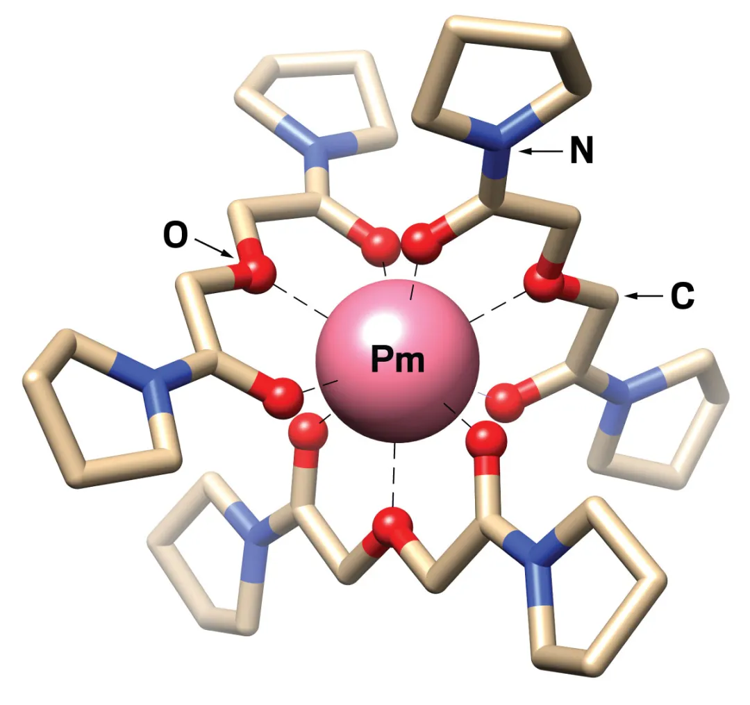 该工作中,橡树岭国家实验室Alexander S. Ivanov和Ilja Popovs教授领导的18位不同领域科学家团队展示了一种在水溶液中合成的由有机二甘醇酰胺配体螯合的稳定147Pm配体并研究了其性质。钷的配位结构、及钷氧键键长首次被表征,填补了我们对元素周期表知识的最后空白之一,标志着稀土研究的重大进展,并可能改写化学教科书。(Nature 2024, DOI:10.1038/s41586-024-07267-6)。