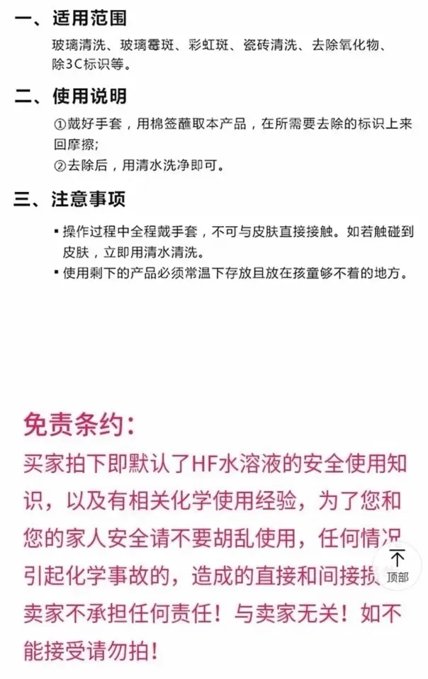 在商品页面上,不少商家提及其功能,写有“清洗玻璃霉斑、彩虹斑,瓷器陶瓷、酸洗金属”等宣传语,但在介绍产品时却仅说明“戴好手套、棉签蘸取;不可与皮肤直接接触,如若接触到皮肤,立即用清水清洗。”并未提及要在通风、戴安全面罩的情况下使用,也未提及剩余试剂的保存问题;同时注明免责条约“买家拍下即默认使用常识和化学使用经验”等内容。