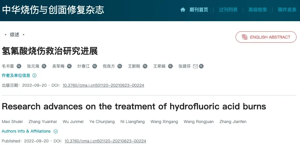 《中华烧伤与创面修复杂志》2022 年发表的《氢氟酸烧伤救治研究进展》一文中指出,氢氟酸烧伤是临床上遇到的非常紧急的状况,接触氢氟酸后除了造成皮肤等部位的烧伤外,还会引起严重的全身中毒。虽然只是小面积氢氟酸烧伤,患者也有可能在数小时内死亡。