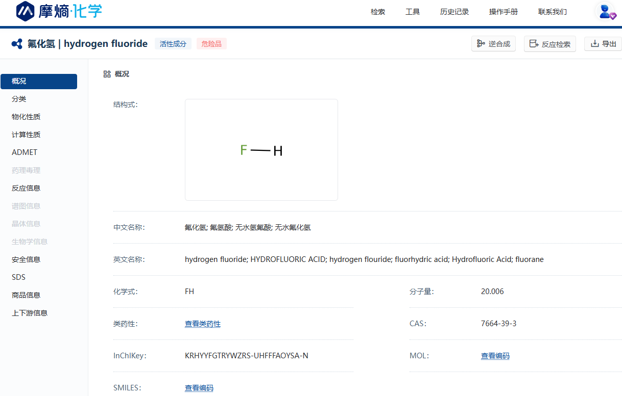 氟化氢,分子式HF,CAS号7664-39-3,分子量20.01,无色、有刺激性气味气体。氢氟酸是氟化氢气体的水溶液,无色透明,有刺激性气味,具有极强的腐蚀性。它能够腐蚀金属、玻璃和含硅的物体,甚至可侵蚀人体骨骼,被称为可怕的“化骨水”。需储存在塑料(如聚四氟乙烯)、蜡质制或铅制的容器中。