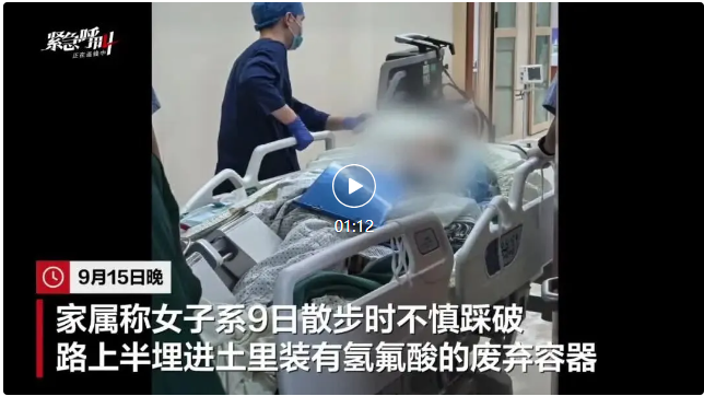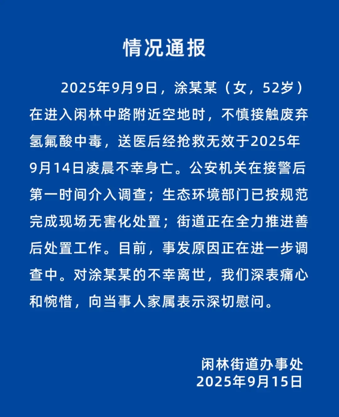 9月14日晚,网友“LIV元宝”发文称,母亲上午9点外出散步时误踩到化学品氢氟酸,当场便无法行走,送医后被确诊氢氟酸中毒。下午3点开始出现心脏衰竭、呼吸停跳,送入ICU后当晚心肺功能衰竭,最终离世。9月15日晚,杭州余杭闲林街道办事处发布情况通报: