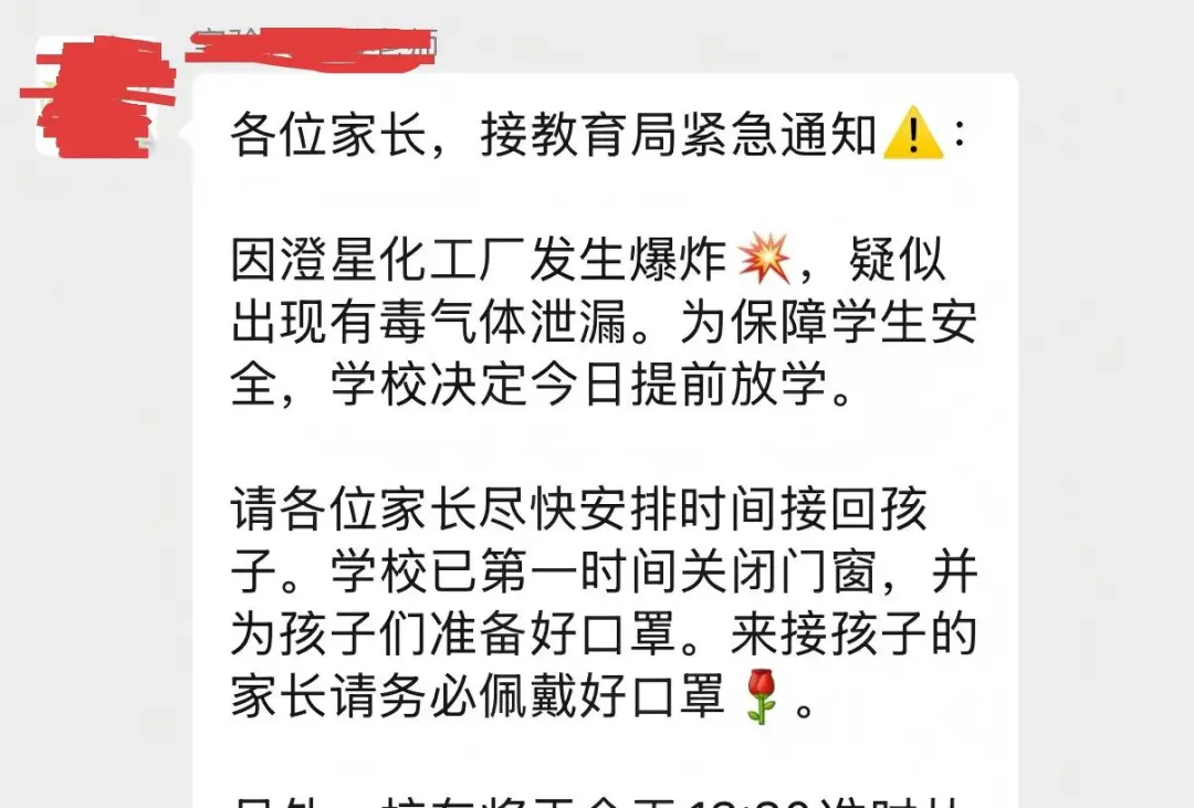 不过在此之前,有疑似当地学校老师在微信群告知家长,接教育局紧急通知,因澄星化工厂发生爆炸,疑似出现有毒气体泄漏。为保障学生安全,学校决定今日提前放学。学校已第一时间关闭门窗,并为孩子们准备好口罩,请家长尽快安排时间接回孩子。并提醒家长,务必佩戴好口罩。
