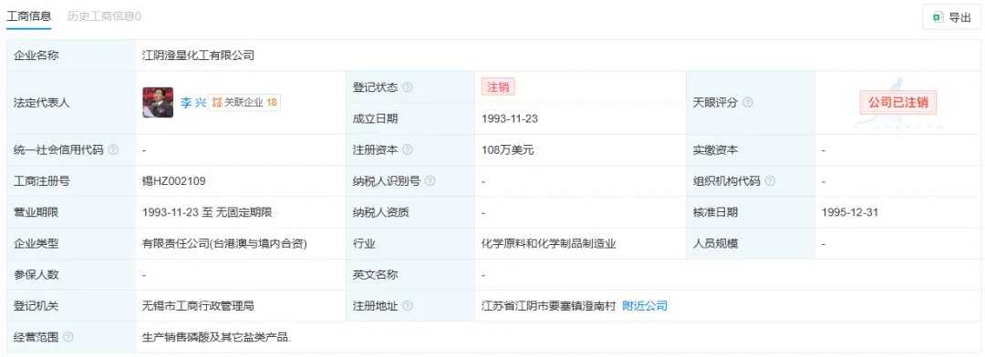 天眼查显示,江阴澄星化工有限公司成立于1993年11月23日,位于江阴市要塞镇澄南村,是一家以从事化学原料和化学制品制造业为主的企业。企业注册资本108万美元,经营范围:生产销售磷酸及其它盐类产品。公司官网显示,澄星股份是一家化工企业,主要产品为黄磷、磷酸及磷酸钠盐、钾盐、钙盐和复配磷酸盐等,在工业、食品、医药、电子等领域被广泛应用。